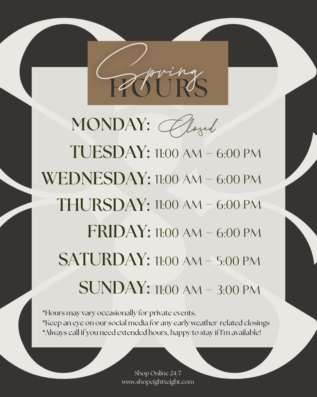 As always reach out if you'd like to schedule a private shopping party or are running behind and need us to stay late!