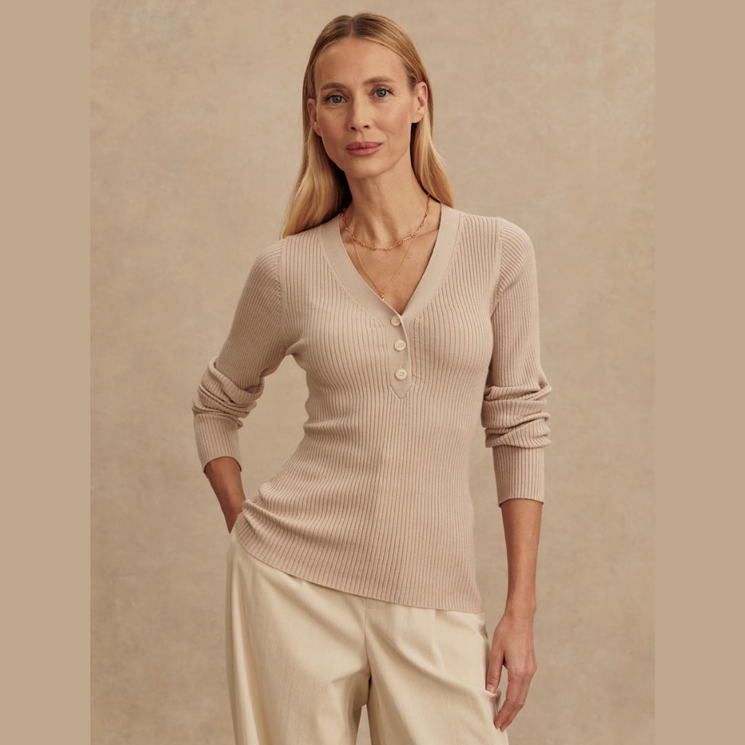 slim-fitting, fine knit designed for effortless layering, the Blanca is both perfect to wear underneath a gilet or style on its own. Made from viscose yarn in a fine-gauge stitch, it's super soft and comfortable. The Blanca has an elegant, flattering design, elevated with a V-neckline, V-placket, and button front.