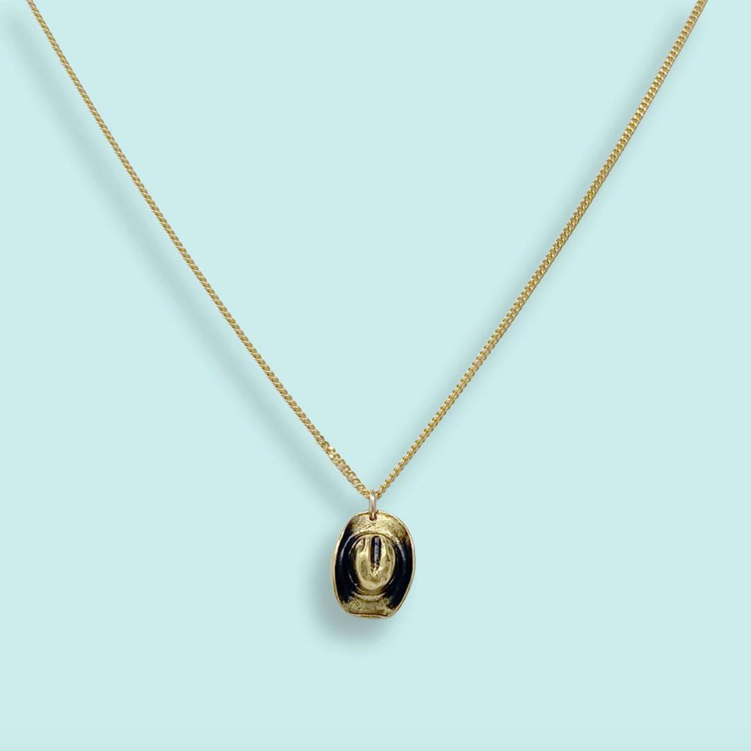 A tiny cowgirl hat pendant (or cowboy hat) on gold curb chain. M