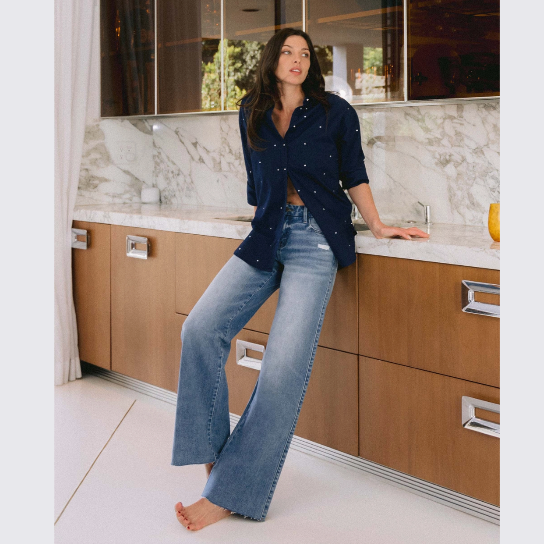 Comfort stretch denim, mid rise waist, slightly distressed detail, clean cut raw hem, full length, wide jeans