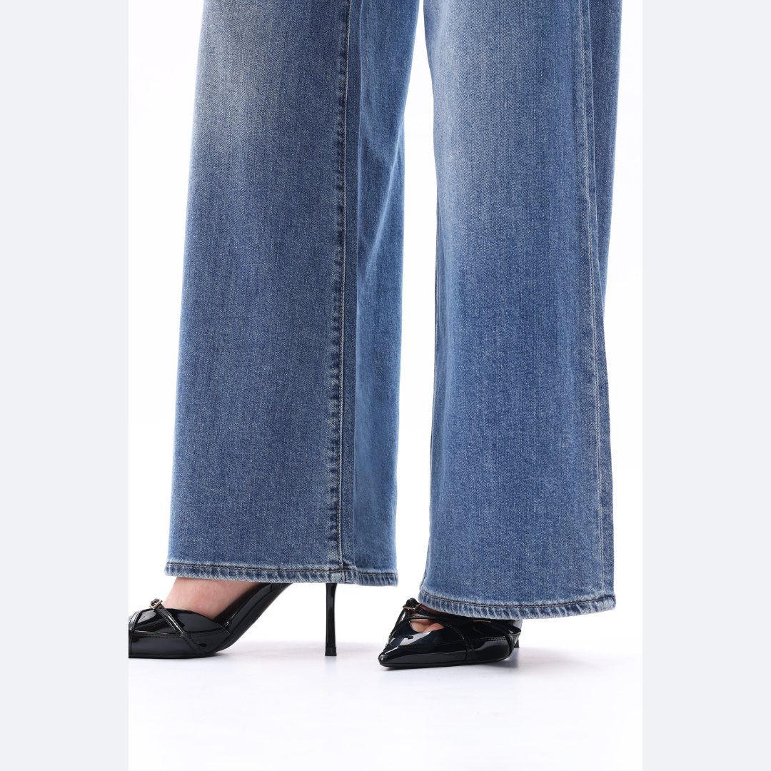These mid-rise wide-leg jeans offer a comfortable, relaxed fit. The classic medium-blue wash with subtle fading on the front and back makes them a versatile piece.