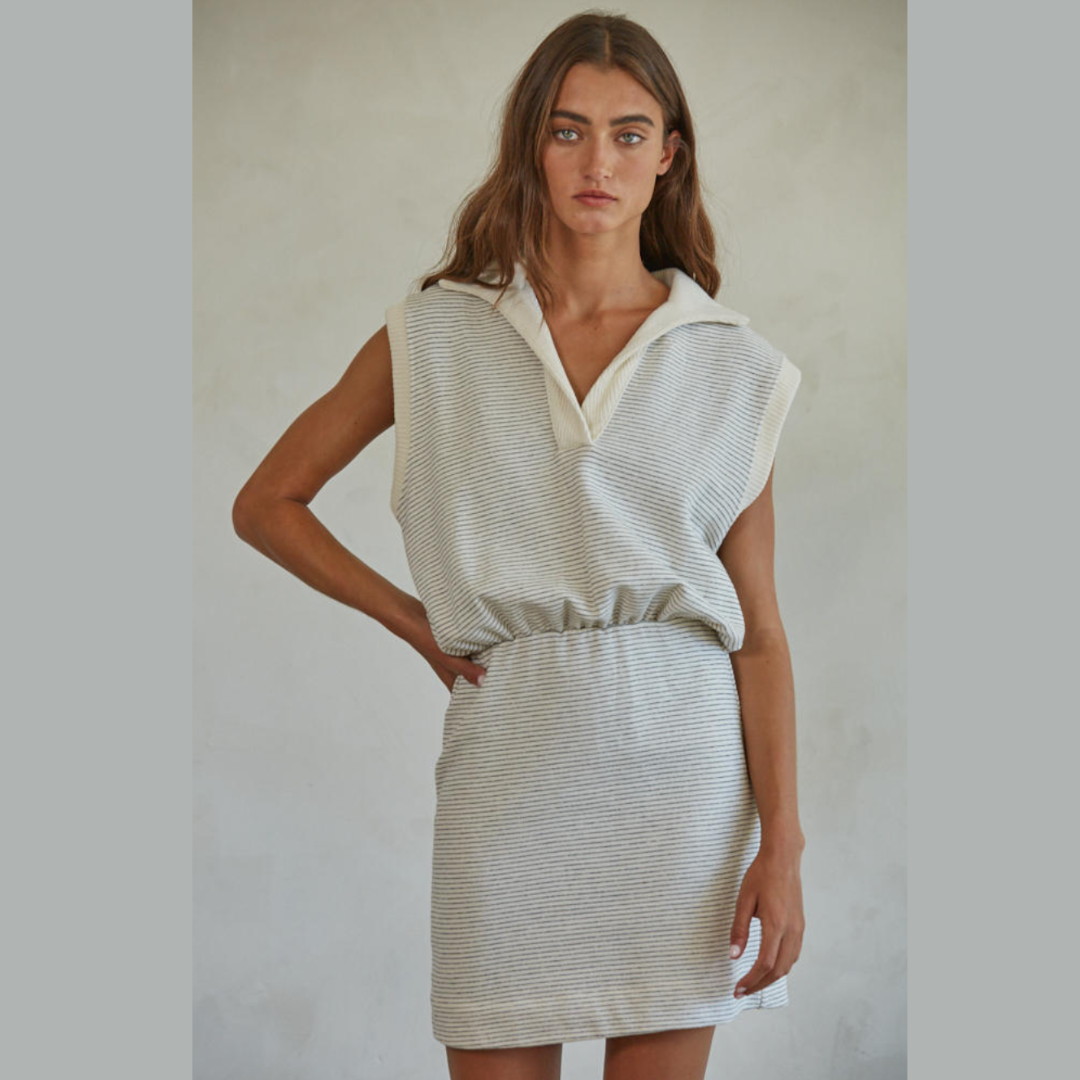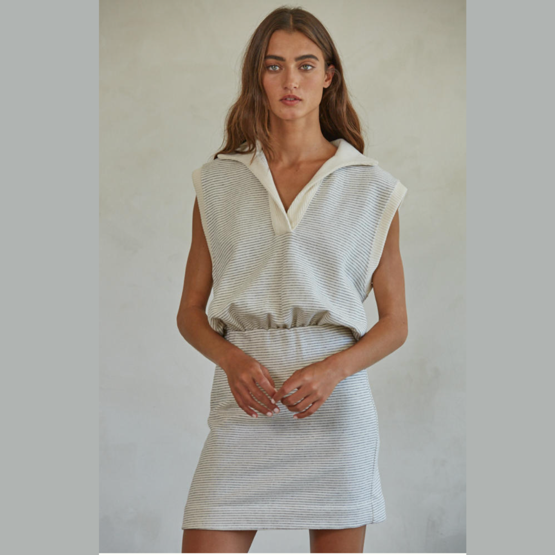 Expertly crafted from a luxurious blend of knit cotton and rayon, the Minnie Dress offers a chic and comfortable option for your wardrobe. With a stylish striped collar and sleeveless design, this mini dress is perfect for any occasion. Made with 94% cotton and 6% rayon, it provides the perfect balance of breathability and durability. Elevate your style with the Minnie Dress.