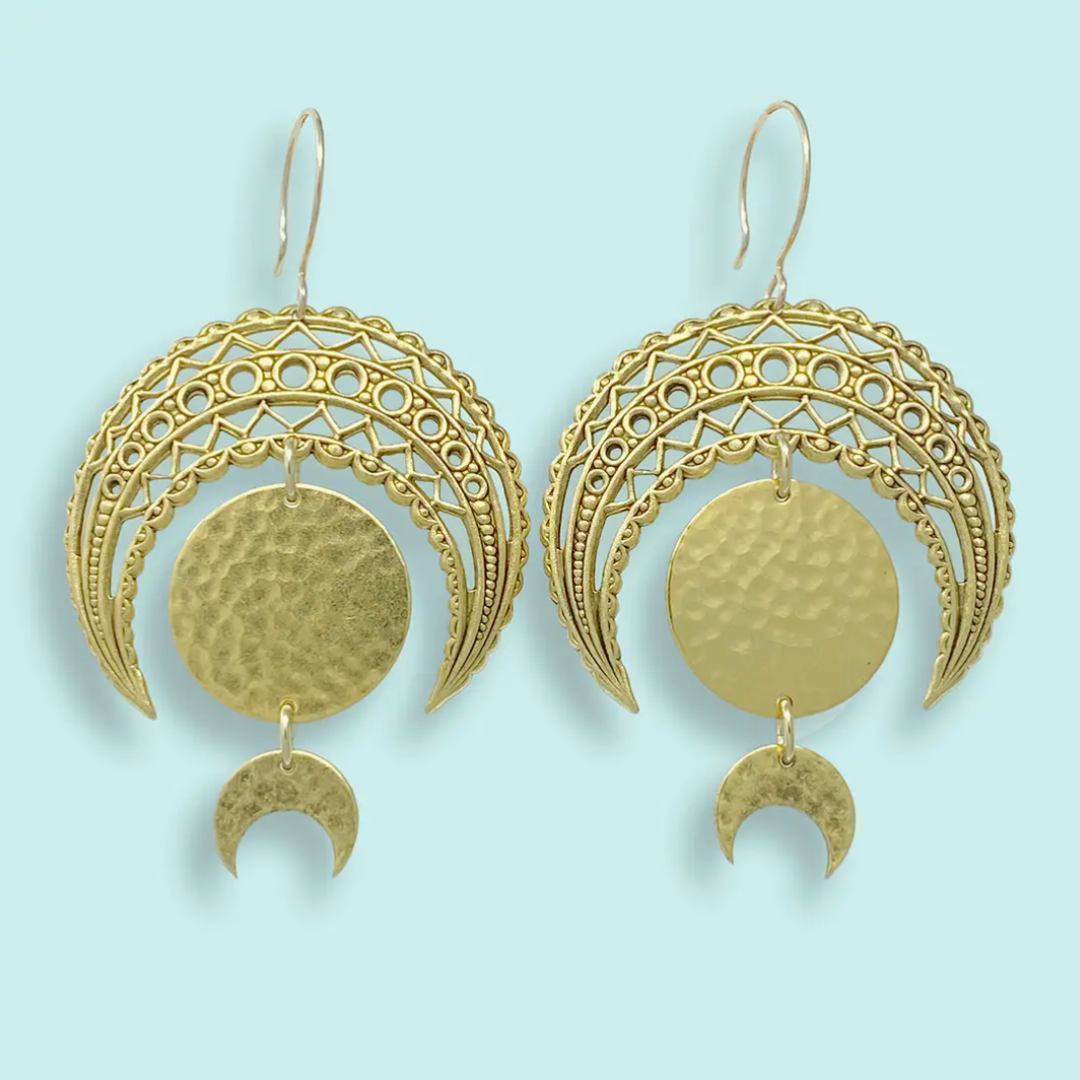 Antique gold nested filigree moon and hammered moons on brass earwires