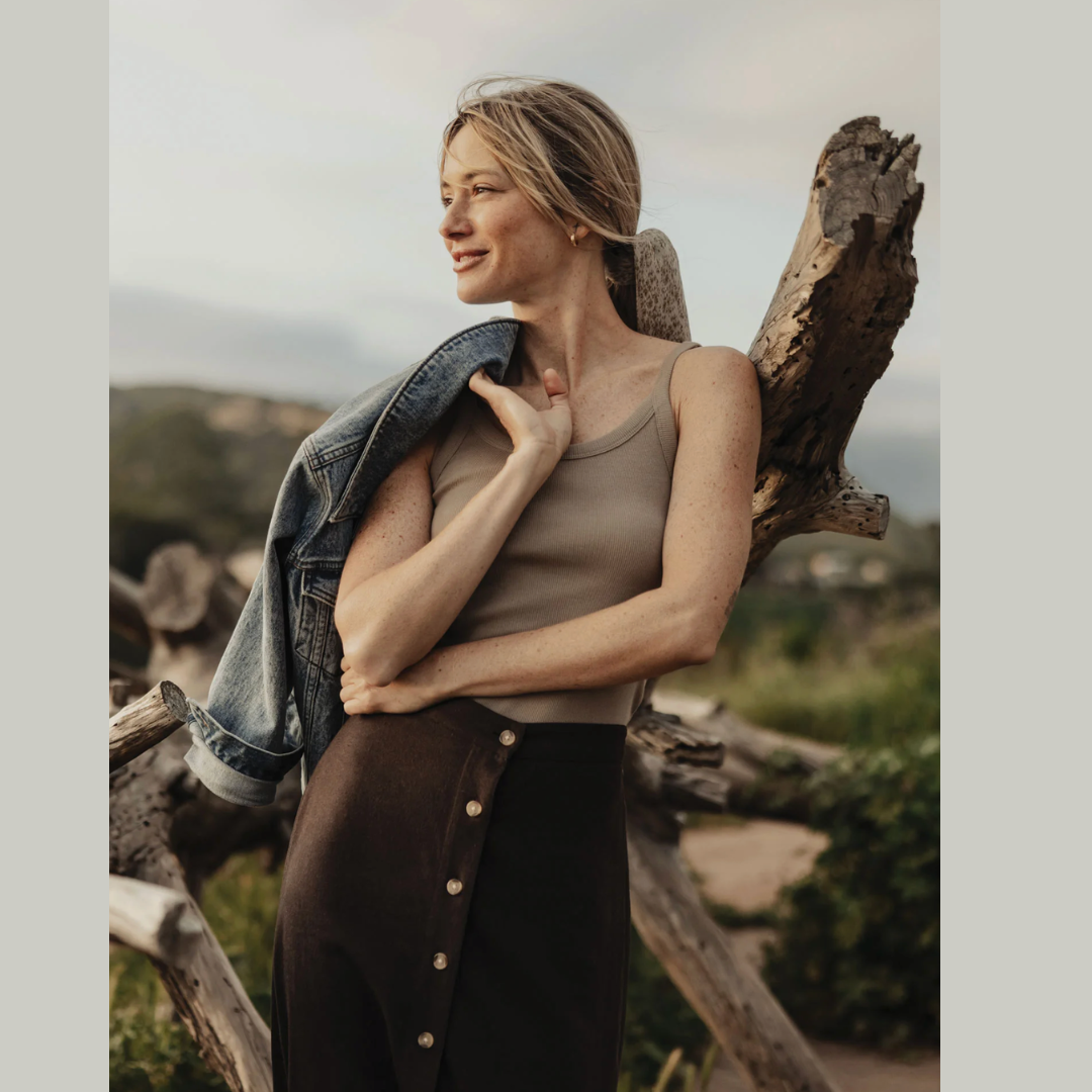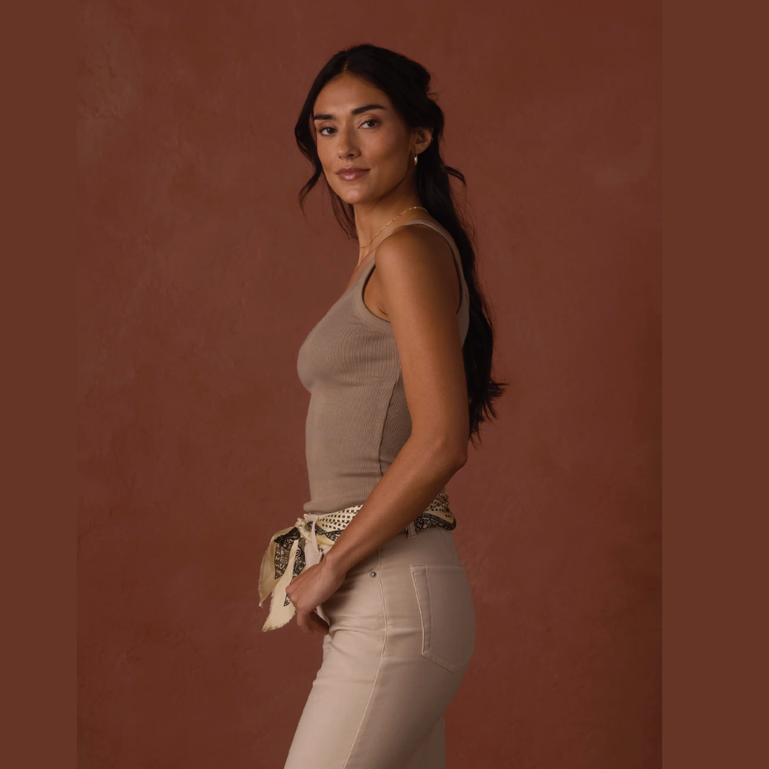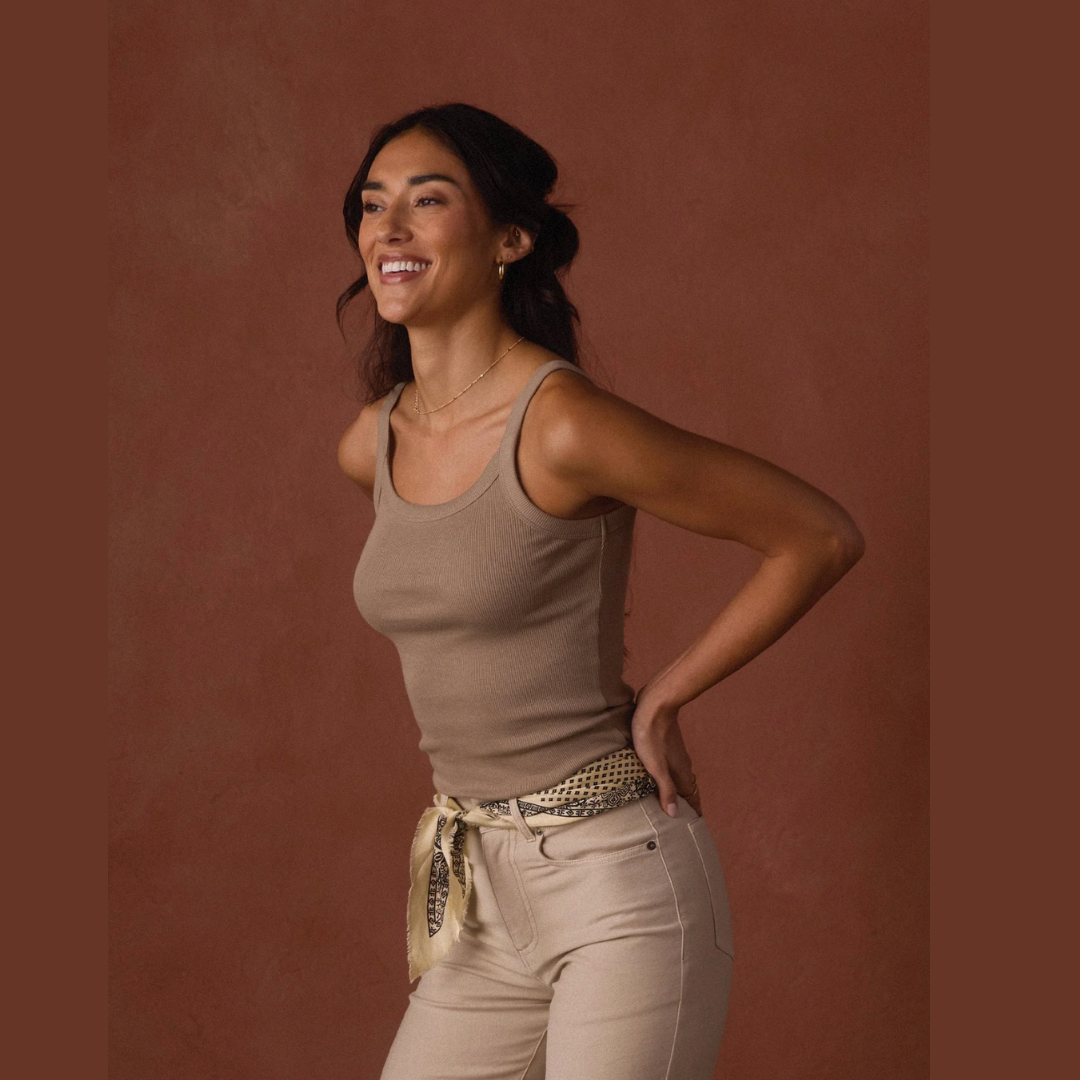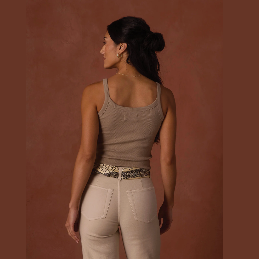 Our essential tank. A fitted, mid-rise length top made from a soft and stretchy cotton-spandex blend that retains its shape while comfortably skimming the body. Designed with self-fabric binding at the neck and armholes, it features double needle coverstitching at all edges for durability. A subtle tonal "TNB" embroidery at the back left hem adds a signature detail, making it a versatile layering piece or standalone staple for everyday wear.