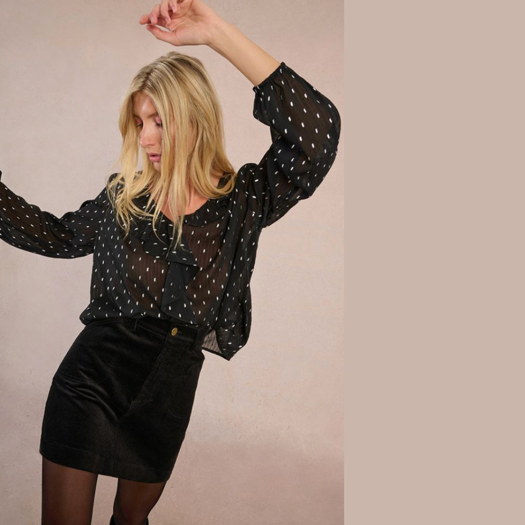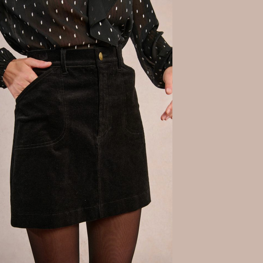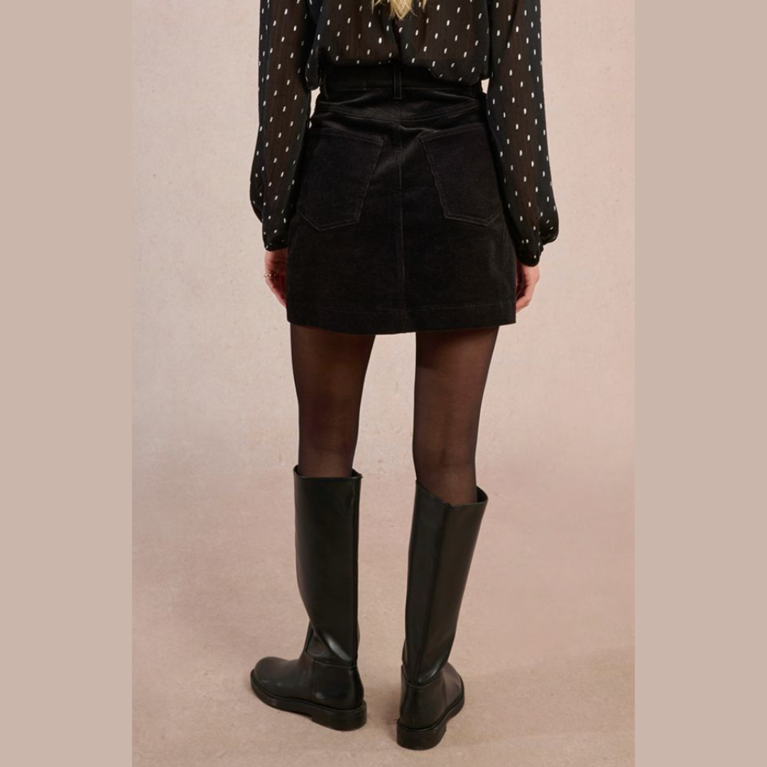 This corduroy mini skirt features a high waist with belt loops for a tailored fit. It includes a zip and button fly closure for easy wear, alongside practical side pockets and back patch pockets, combining style with functionality. Ideal for creating polished, versatile outfits with comfort and ease.
