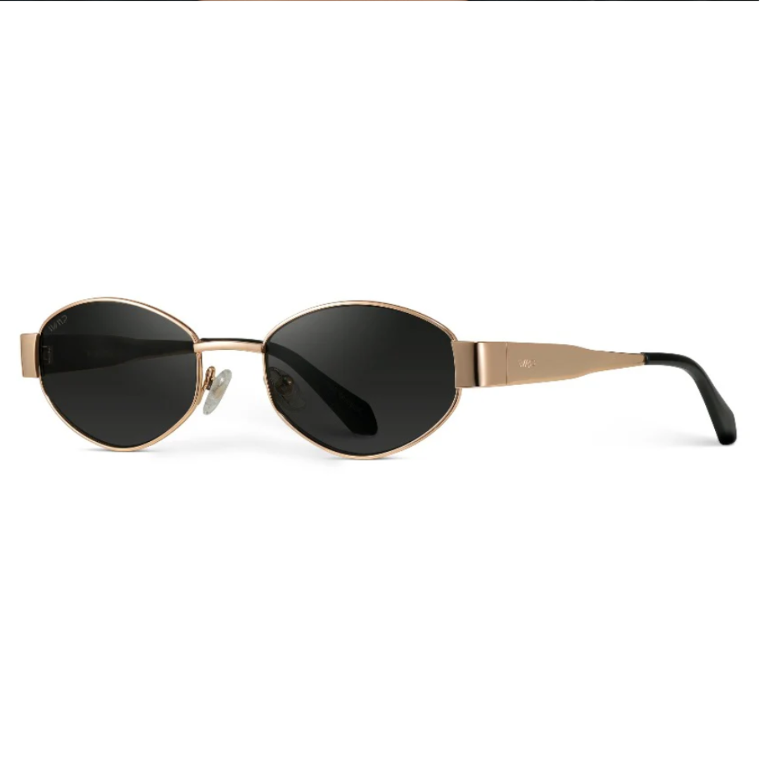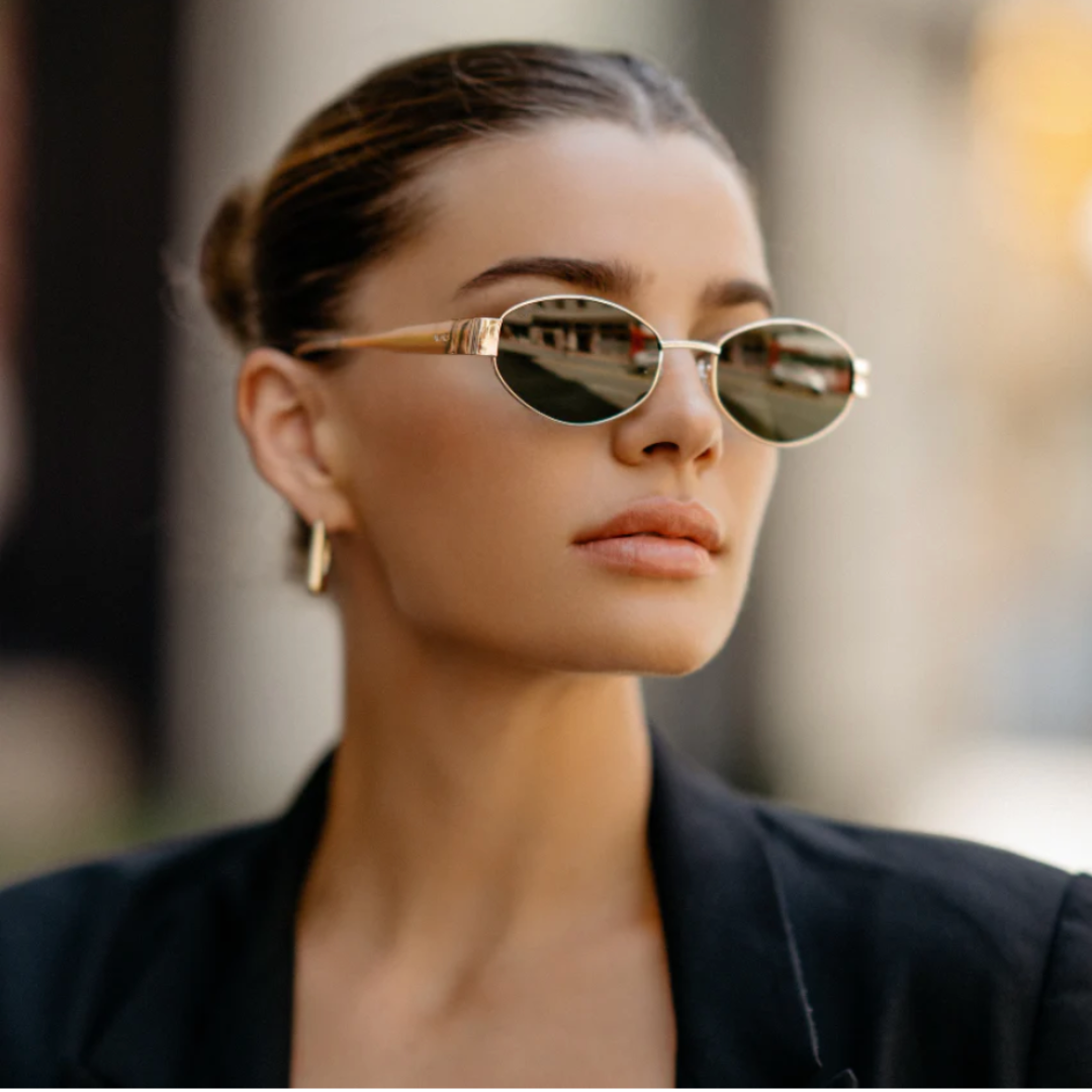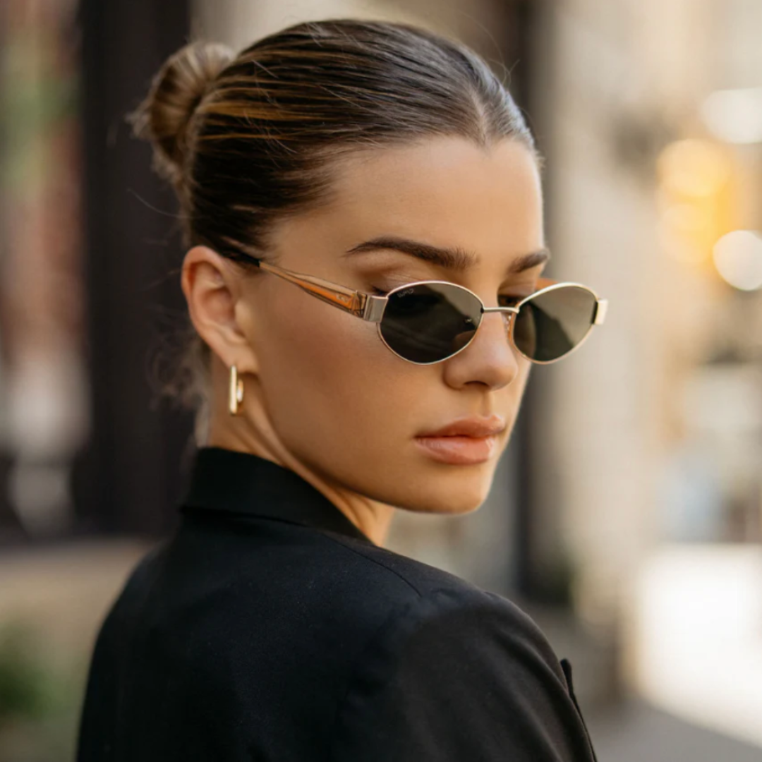 Verona makes a statement with its softly angled oval shape and sleek stainless steel construction. Its chunky gold temples and thick arm pieces are balanced by a thin front-facing frame, for a subtly sophisticated addition to any look.
