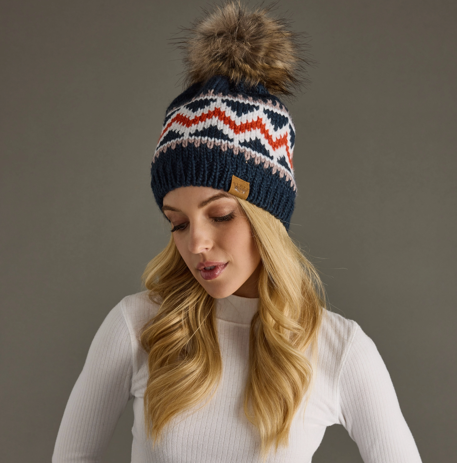 Fleece lined Natural faux fur pom accent 100% Acrylic